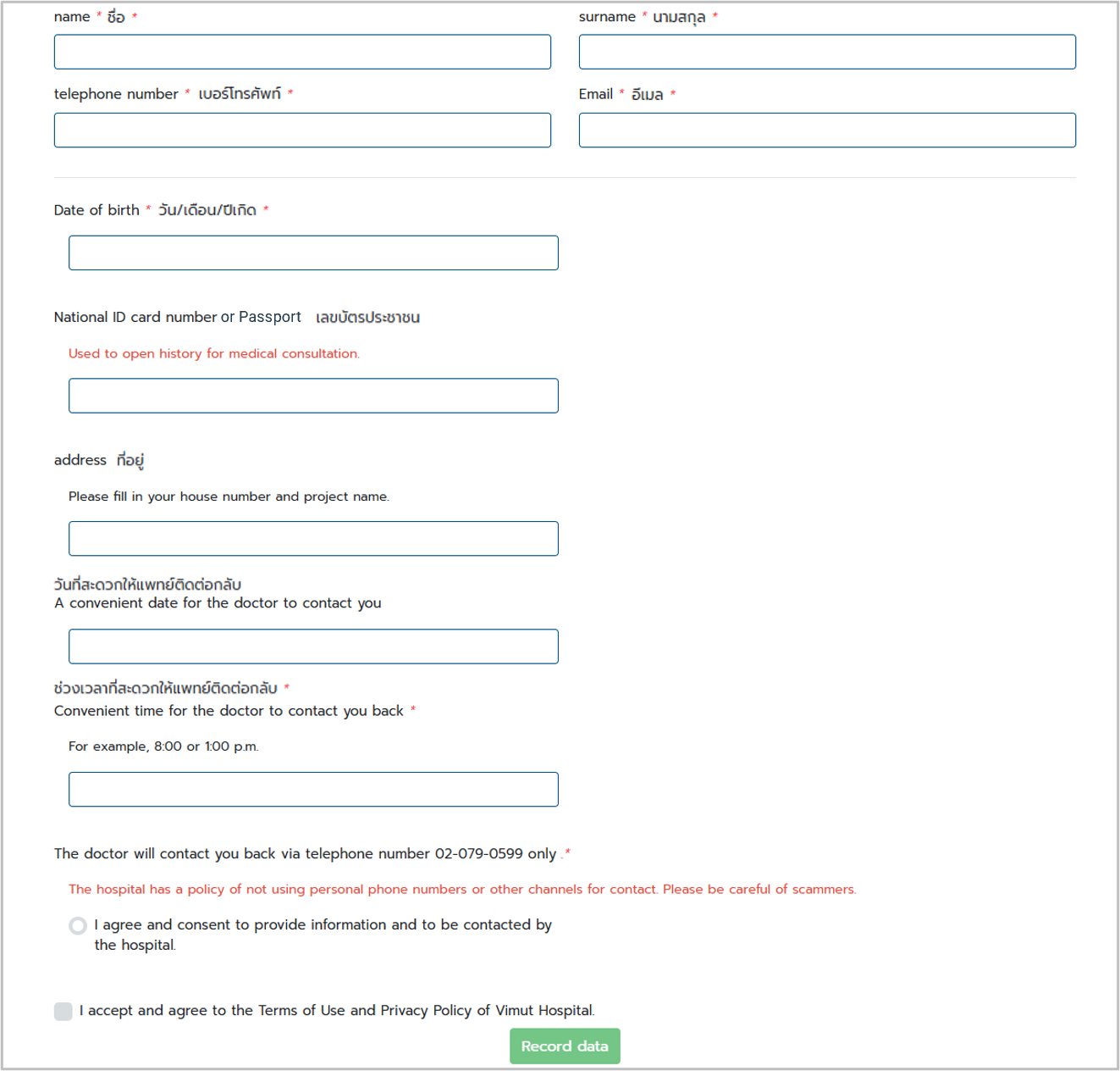 ข้อมูลส่วนบุคคลที่โรงพยาบาลเก็บรวบรวม ประเภทของข้อมูลส่วนบุคคลที่โรงพยาบาลเก็บรวบรวมจากท่านจะขึ้นอยู่กับสถานการณ์ของการเก็บรวบรวม และประเภทของการบริการที่ท่านร้องขอจากโรงพยาบาล ข้อมูลส่วนบุคคลของท่านจะถูกนำมาใช้เพื่อให้การทำ